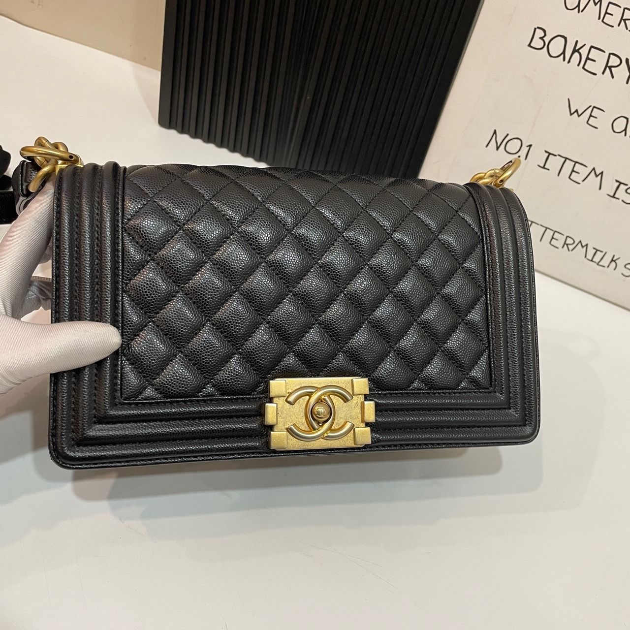 Be the first to review “Chanel Boy Handbags Pebbled Leather Black 25.5cm”